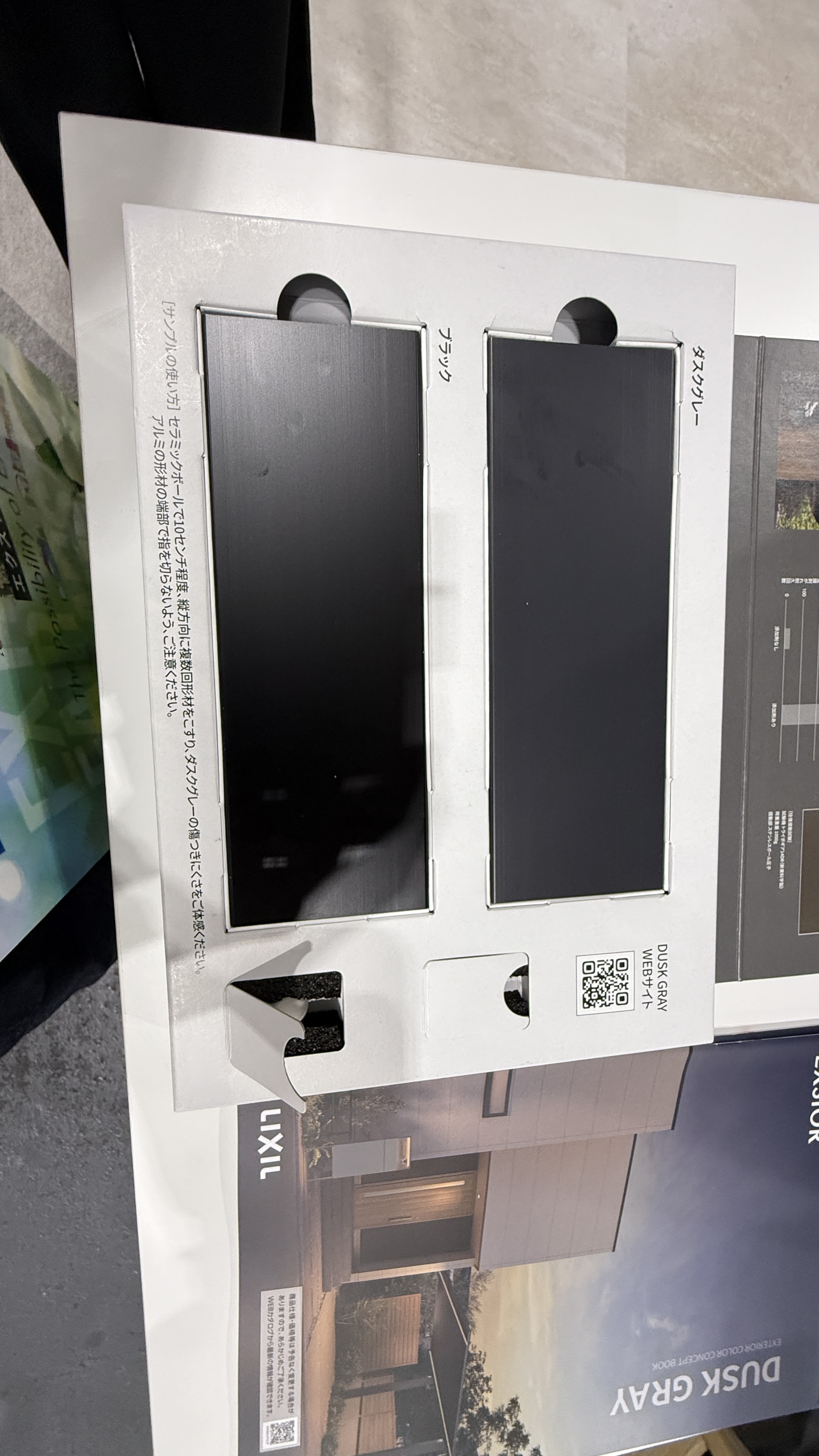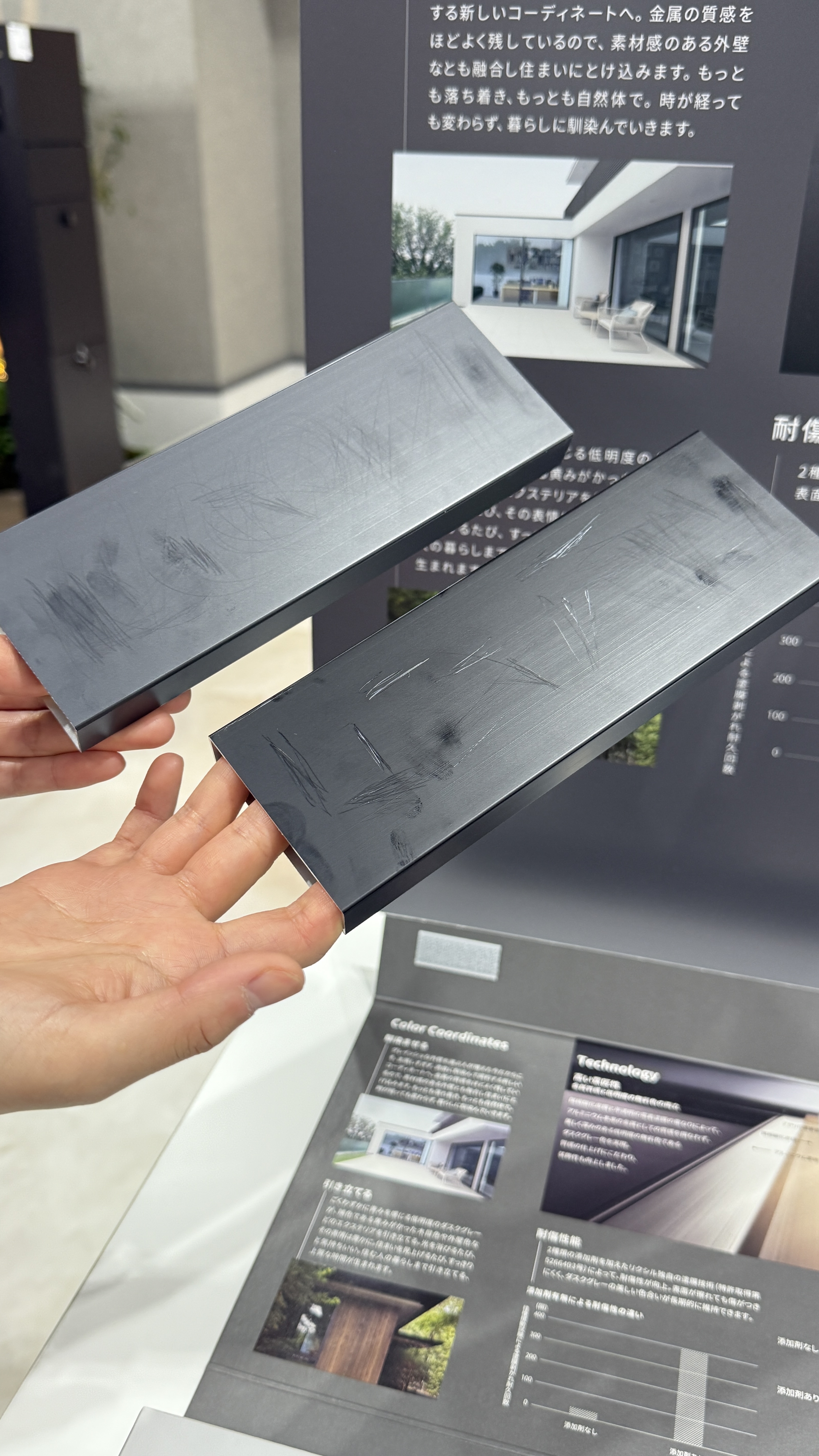 展示場にあった耐傷性体験キット。上がダクスグレー。
