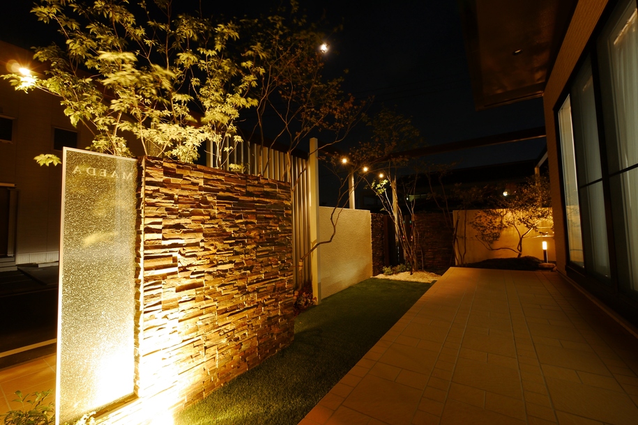 プラスGと絡む緑、夜にはフレームから降る灯りなどでイメージよく自然なモダンスタイル。