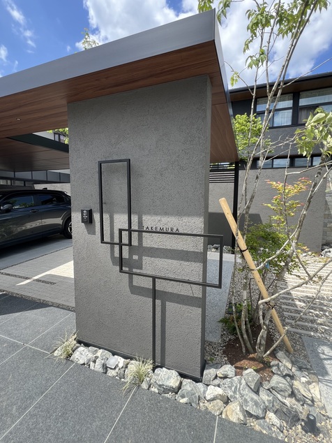 木調の縦格子デザインの柱が程よく視線を遮りつつ、デザイン性も高めています。モルタル調の門柱壁が重厚感を演出し、家の顔となっています。表札やインターホン、ポストもシンプルでモダンな黒のフレームで統一されています。
