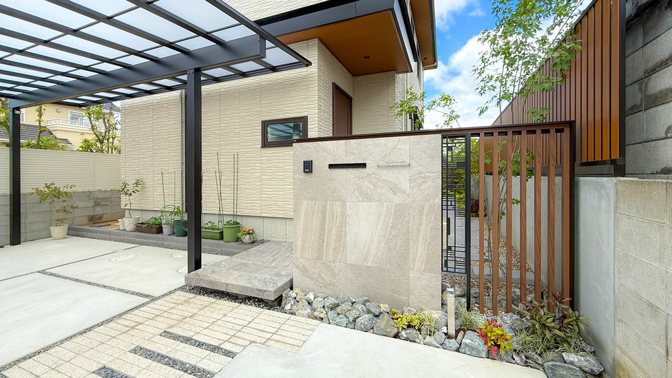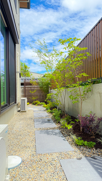 WORKS モダン外構 素敵な緑の通路 岡山市北区 お庭の通路面に目隠しとモルタル壁と緑 モダン外構 カーポートの持ち出し屋根でアプローチも濡れず、庭の通路は緑豊かに大型の平板1200×600でリズミカルに。 COMMENT お庭の通路 緑とモルタル壁と木目調フェンスの調和。 下草が豊富で綺麗ですね。 お施主様一言 綺麗に仕上げていただきありがとうございます。 緑がかわいらしいですね。 お庭の通路 お施主様一言 PREV WORKS NEXT