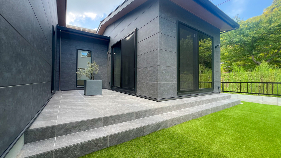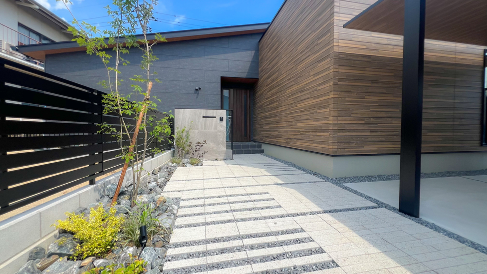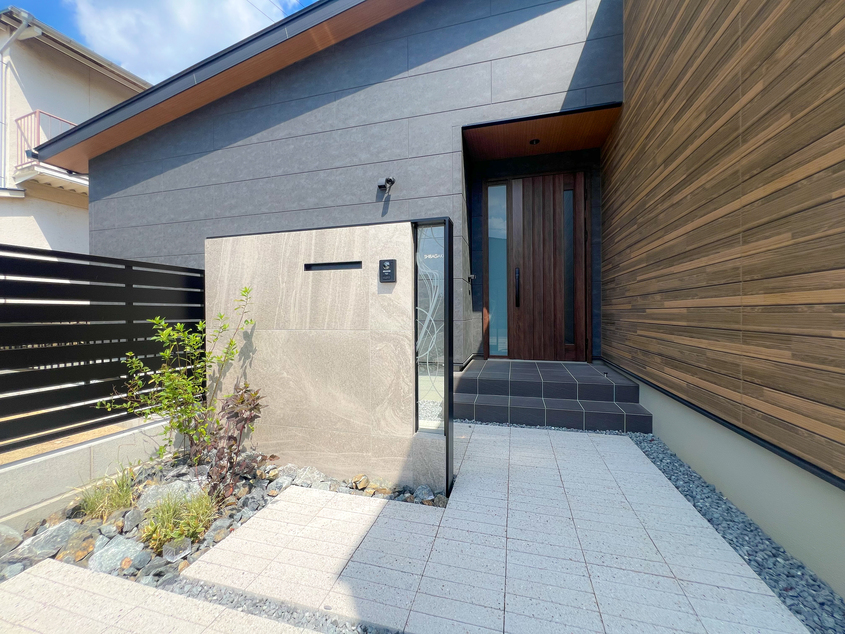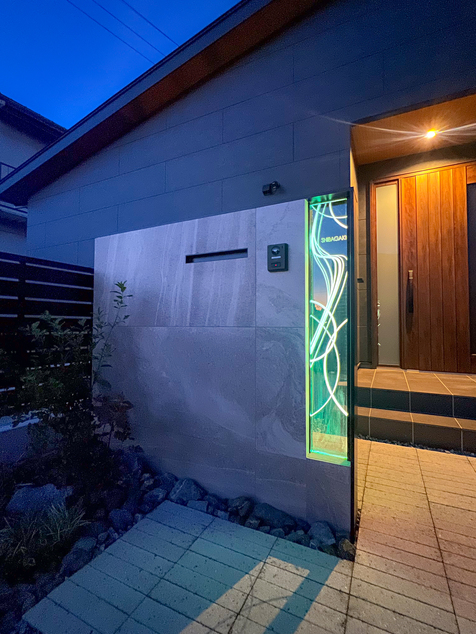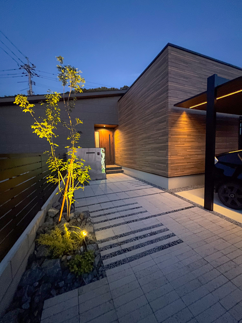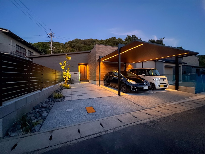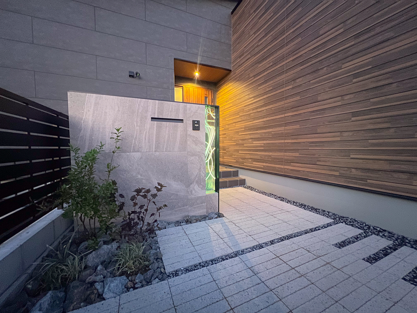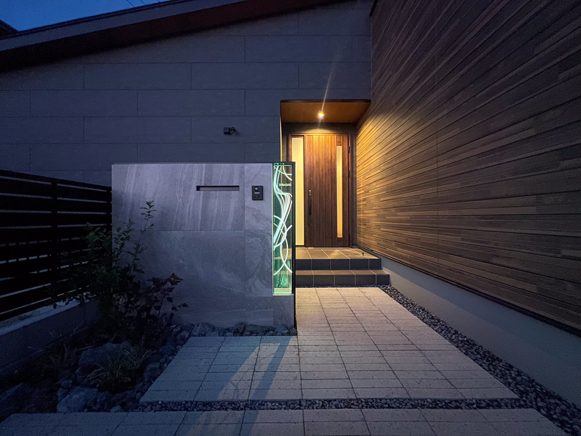 タイル貼りの門柱落ち着いた石目調のタイルを使用し、上質で重厚感のある雰囲気を演出しています。ガラスサインのアクセントサイドに組み込まれた縦長のガラス部分が、夜になると内部の照明で美しく光り、存在感を放ちます。ライティング効果照明の光がガラス模様を際立たせ、幻想的で高級感のある門まわりに仕上げています。全体の調和木目調の玄関ドアとの相性も良く、モダンさと温かみを両立したデザインになっています。カーポートFⅡの木目天井+ラインライトあり。背面外壁とマッチしてよいですね